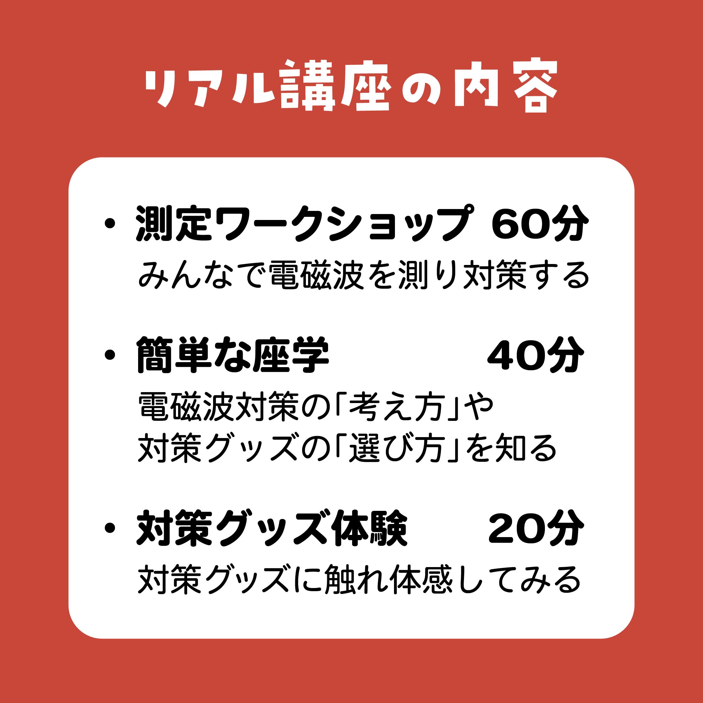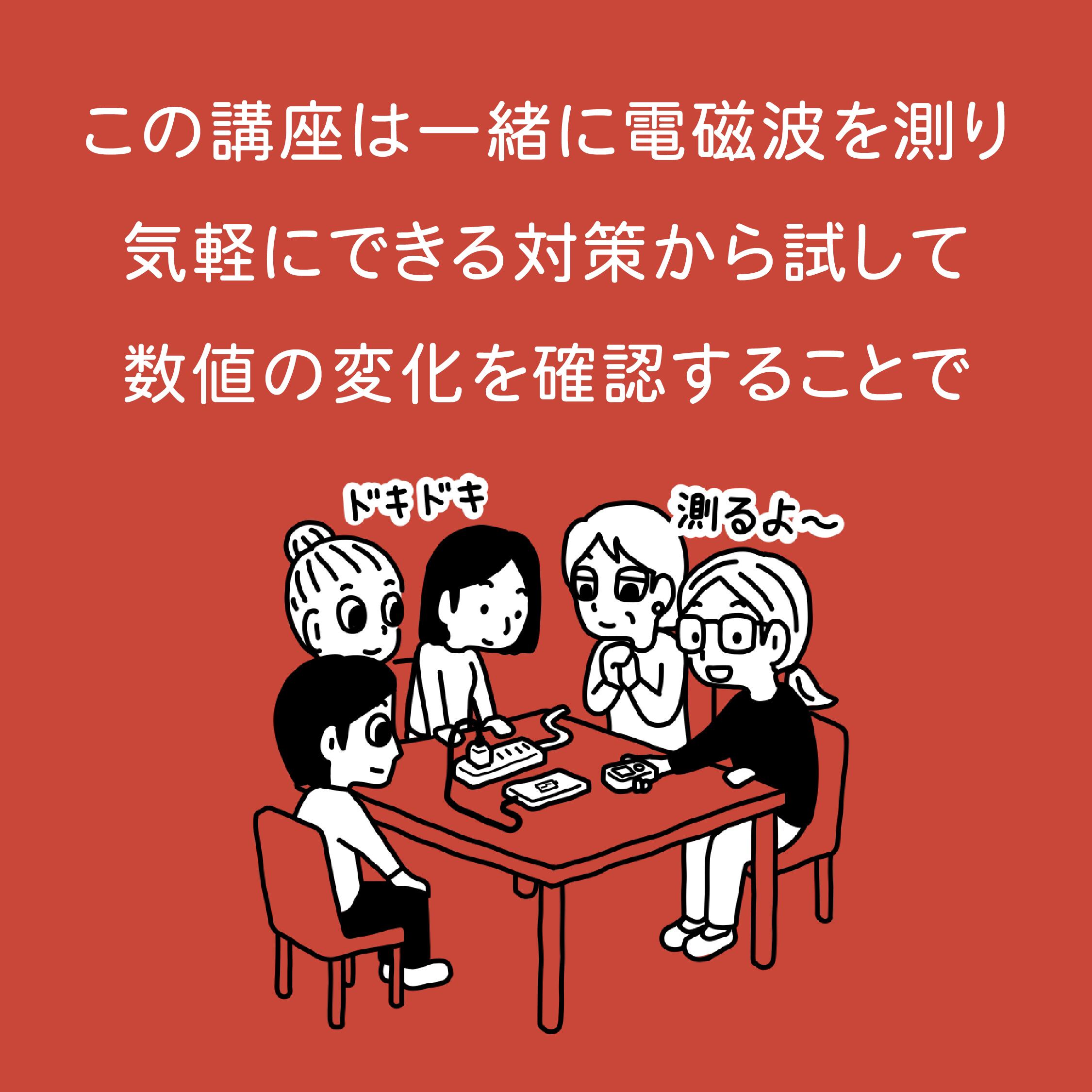このリアルセミナーは、みんなで一緒に電磁波を測り、気軽にできる対策を試して、数値の変化をその場で確認しながら、