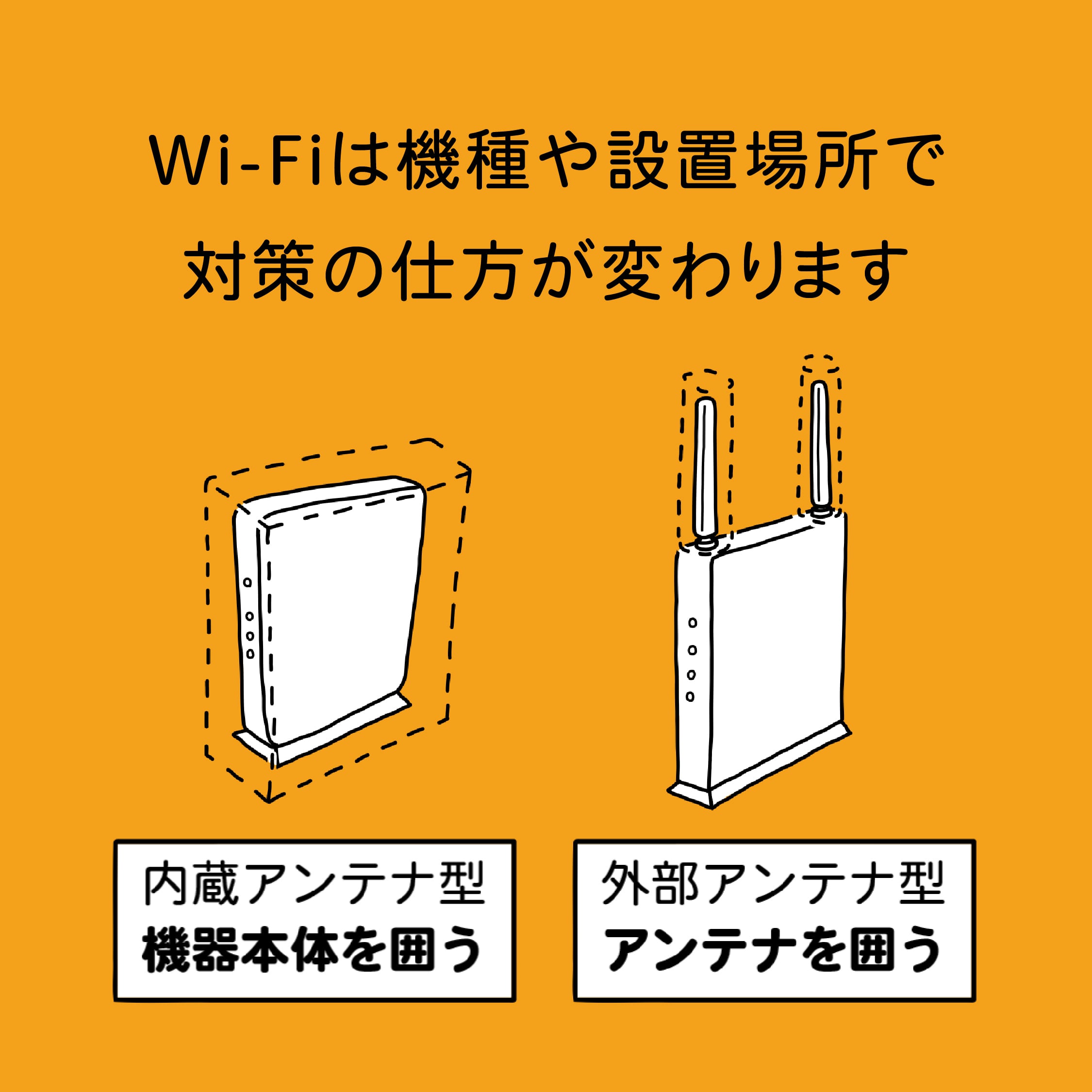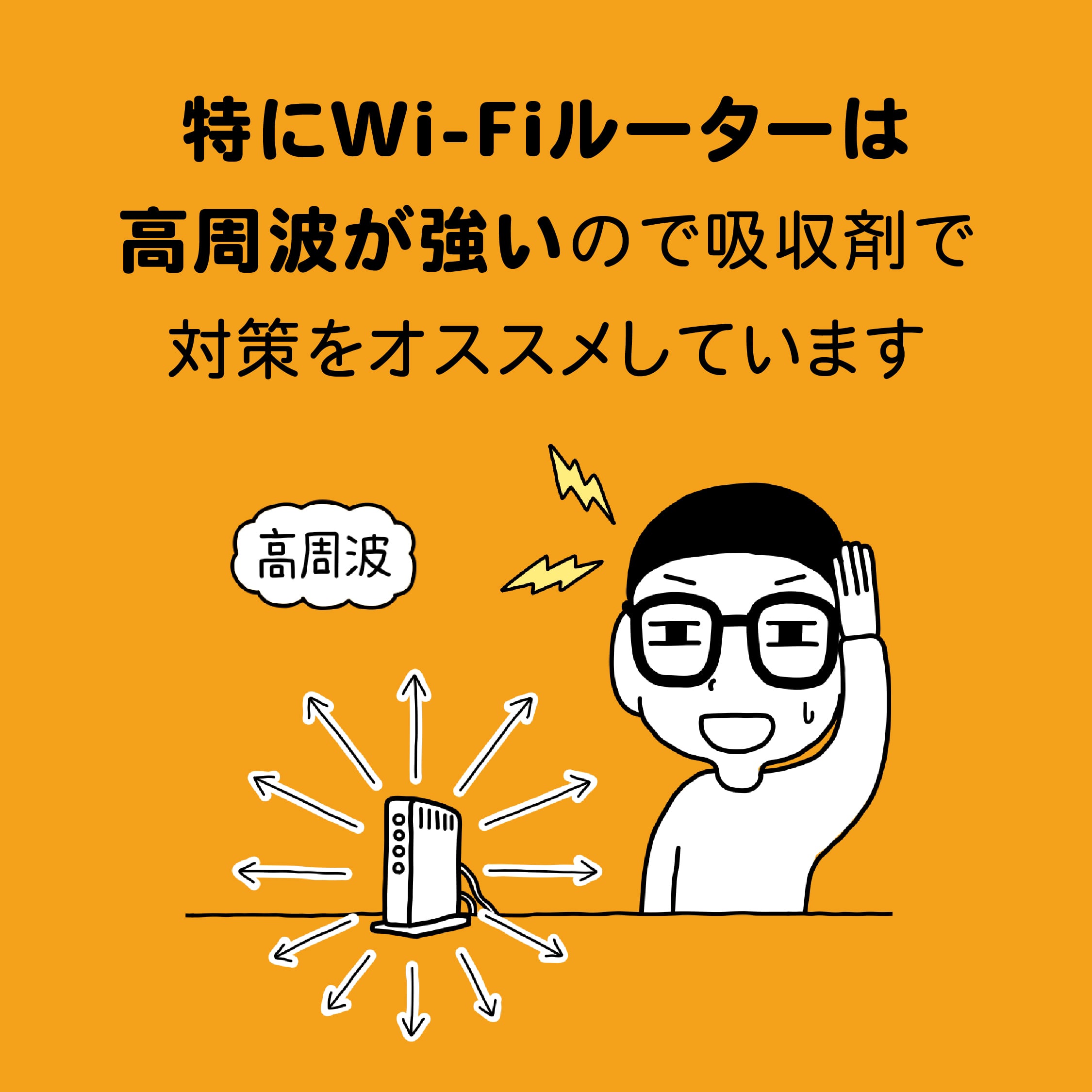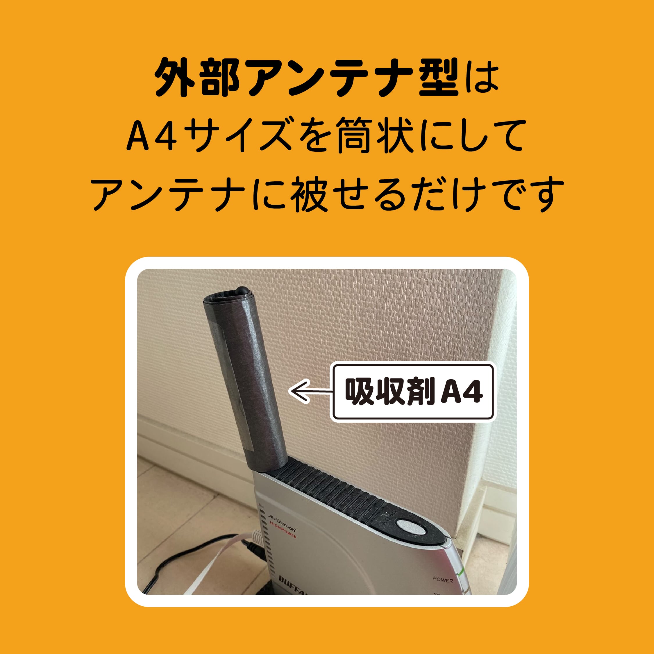 また、ルーターが「アンテナ内蔵型」でしたら、ルーター本体を「吸収剤」で囲う必要がありますが、Wi-Fiルーターの排熱口をふさがないご注意ください。