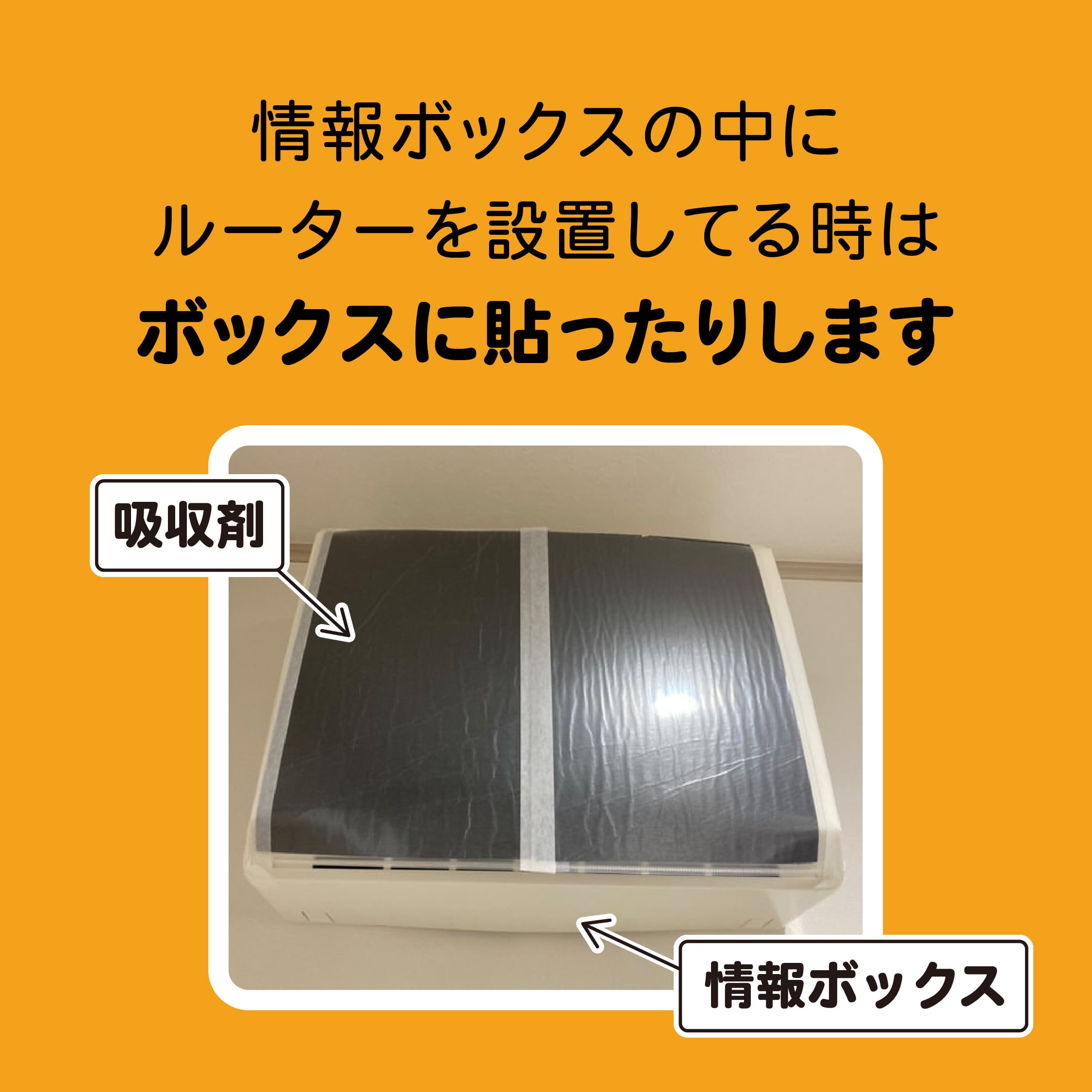 うすい段ボールや厚紙などでルーターより少し大きい箱を作り、箱の外側に「吸収剤」を貼ったり、箱の内部でふんわり囲うのも1つです。