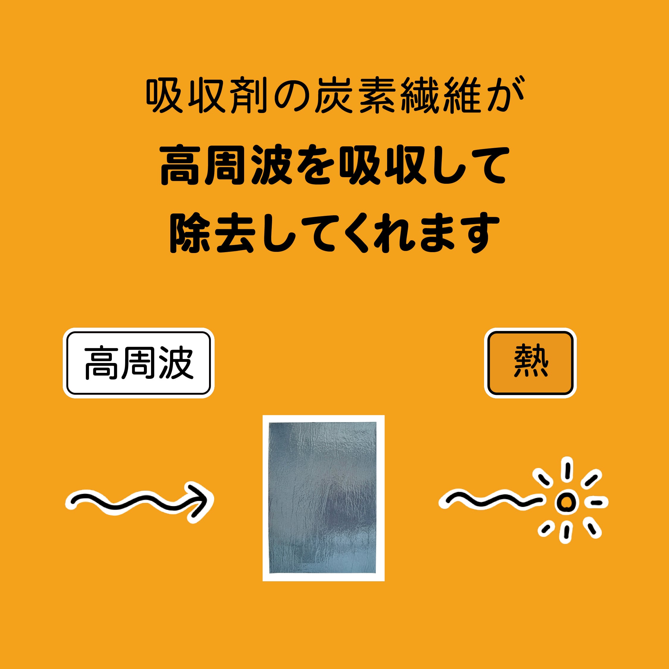 「高周波吸収剤」は素材の炭素繊維が「高周波」を吸収し「熱」に変換する働きがあります。