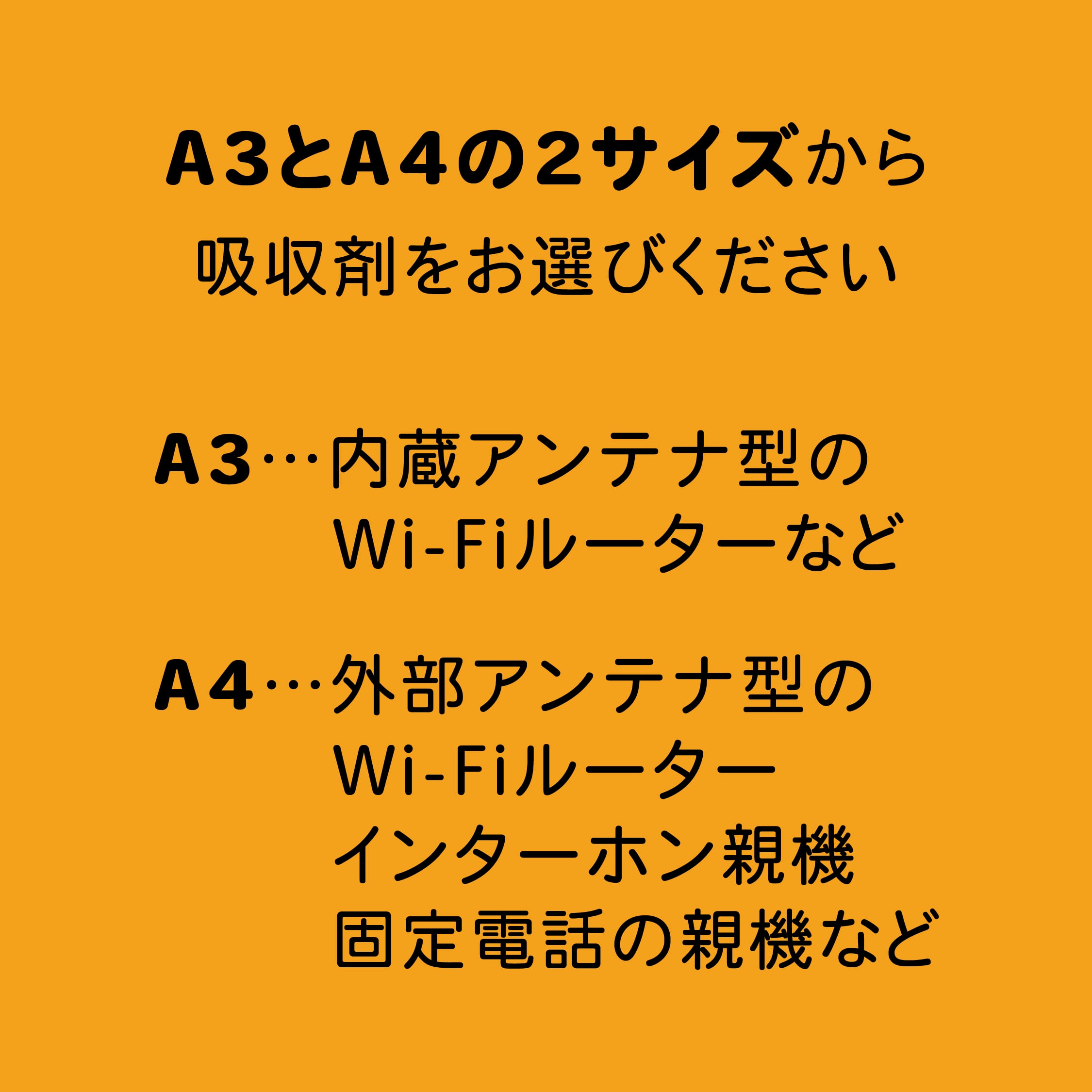 目安として「内蔵アンテナ型」はA3サイズ 1枚、「外部アンテナ型」はA4サイズ1枚が必要になることが多いので、お使いの機種にあった「吸収剤」をご購入ください。